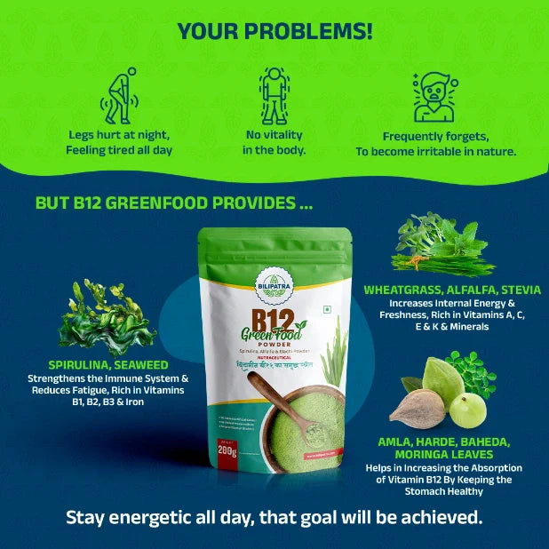 B12 Greenfood Powder एक सुपरफूड ब्लेंड है जिसमें है Spirulina, Alfalfa, Wheatgrass, Amla, Harad, Bahera और Moringa.